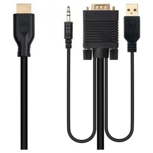 Cable conversor unidireccional de VGA macho a HDMI macho. Con cables adicionales para alimentación (USB-A) y audio (Jack 3.5mm)