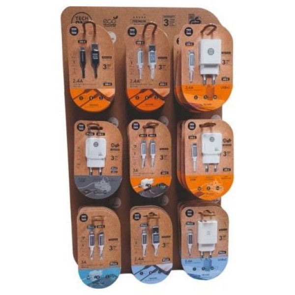Elegante expositor de peana TECH ONE TECH, con 9 ganchos y 3 productos en cada gancho, total 27 productos de cargadores y cables más vendidos.