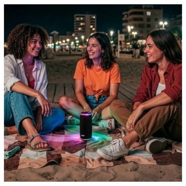 Altavoz Bluetooth con 25 W de potencia y dos grandes diafragmas para un sonido sublime, luces sincronizadas con la música opcionales, 20 horas de duración de la batería, alta resistencia al agua y asa integrada para un transporte cómodo.