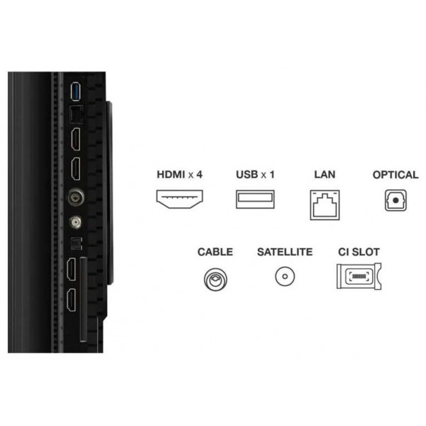 | Conectividad | - Bluetooth 5.4 - WiFi 5 Puertos - 4 x HDMI - 1 x USB - 1 x LAN - 1 x Conector linea optica - 1 x Cable - 1 x Satelite - 1 x Conector del CI |
