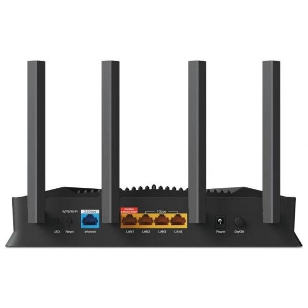 | Hardware | Puertos Ethernet - 1 x WAN de 2,5 Gbps - 1 x LAN de 2,5 Gbps - 3 x LAN de 1 Gbps Compatibilidad con USB - 1 x USB 3.0 - Formatos de partición compatibles: NTFS, exFAT, HFS+, FAT32 - Funciones compatibles: Servidor FTP Servidor multimedia Servidor Samba Botones - Botón de encendido/apagado - Botón LED - Botón WPS - Botón de reinicio Alimentación - 12 V ? 2 A |