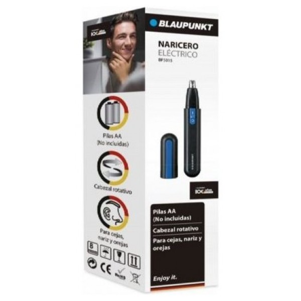 Blaupunkt BP5015 es un naricero eléctrico compacto con cabezal rotativo y alimentación a 1 pila AA para eliminar vello de nariz, orejas y retoques en cejas con precisión y bajo ruido. El cabezal se lava bajo el grifo y el cuerpo está protegido contra salpicaduras.