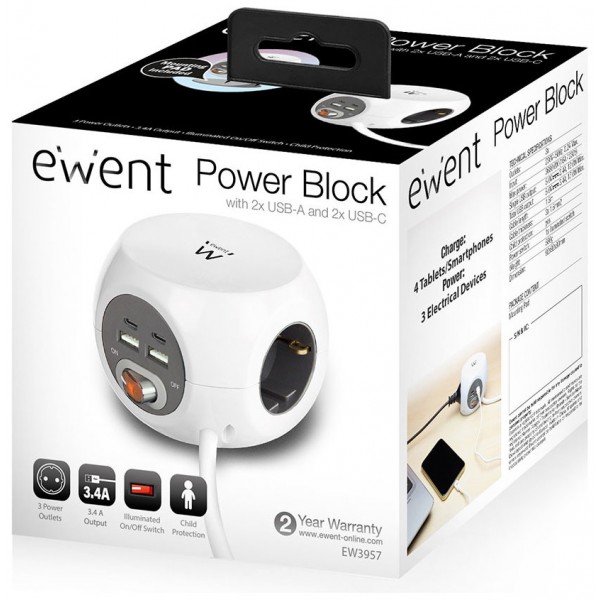 EWENT REGLETA 3 TOMAS SHUCKO + 2 PUERTOS USB-C + 2 PUERTOS USB (3.4 A / 17W) (Espera 4 dias)