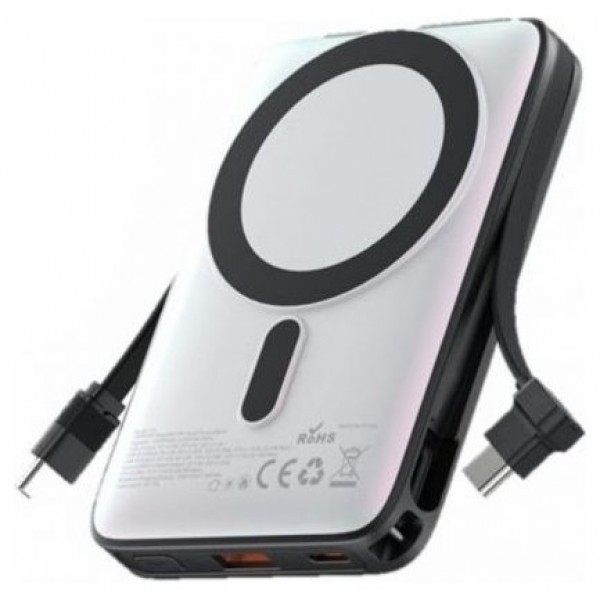 Batería externa magnética de 10,000 mAh (USB-C + USB-C/USB-A/Inalámbrico) con cable incorporado y soporte. Potencia de salida: 22.5 W Pantalla LED blanca Material: ABS con recubrimiento UV Soporte de aleación de aluminio