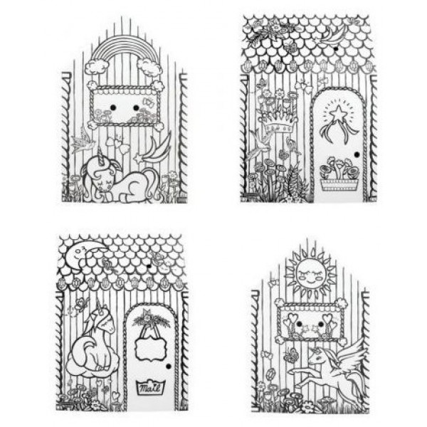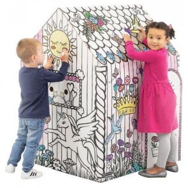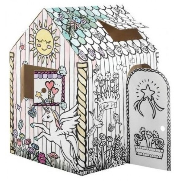 Casita de juegos realizada en resistente cartón ondulado con motivo de unicornio, lista para colorear, fácil montaje en dos piezas, puertas y ventanas que se abren e impresa con tintas al agua sobre cartón certificado FSC.