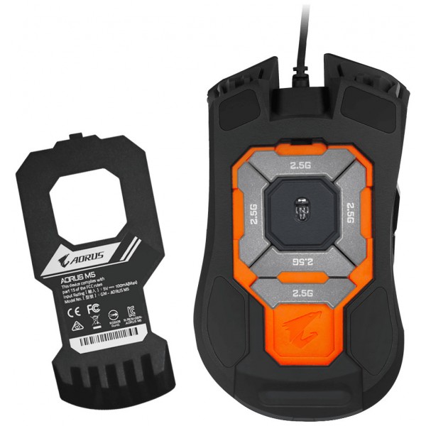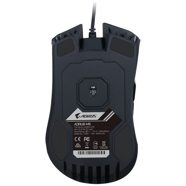 Gigabyte AORUS M5. Factor de forma: mano derecha. Tecnología de detección de movimientos: Óptico, Interfaz del dispositivo: USB tipo A, Resolución de movimiento: 16000 DPI, Tipo de botones: Botones presionados, Tipo de desplazamiento: Rueda, Aceleración (máx.): 50 G. Iluminación de color: Rojo/Verde/Azul. Fuente de energía: Cable. Color del producto: Negro