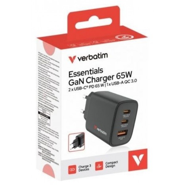 Carga de forma más inteligente y rápida con el cargador GaN Verbatim Essentials de 65 W: la solución de carga elegante y de alto rendimiento con tecnología GaN y compatibilidad con la carga simultánea de varios dispositivos.