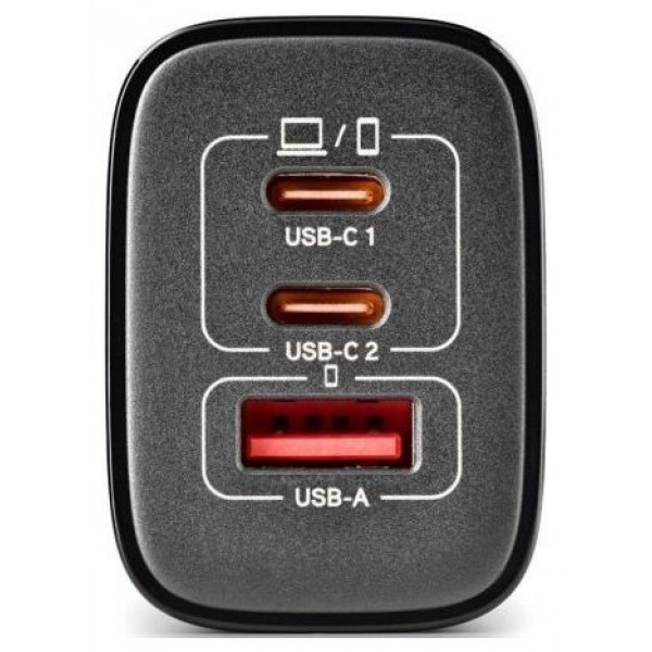 - Cargador GaN de pared con 2 salidas USB-C (PD & PPS) y una salida USB-A QC 3.0 de 65W de potencia máxima para cargar dispositivos de manera rápida y eficiente.