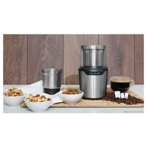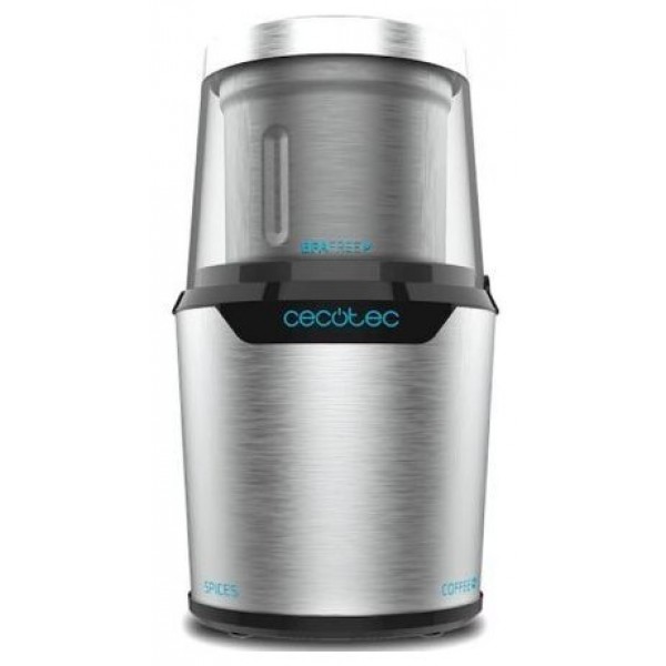 - Molinillo con cuerpo, depósito 100 % de acero inoxidable y 300 W de potencia.