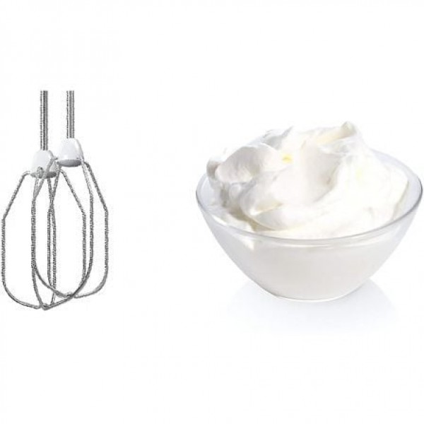 Equipada con dos varillas batidoras y dos garfios amasadores.