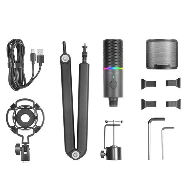 Incluye: Micrófono, soporte antivibraciones, brazo articulado, filtro anti pop, abrazadera de escritorio, cable USB-A a USB-C y sujeta cables