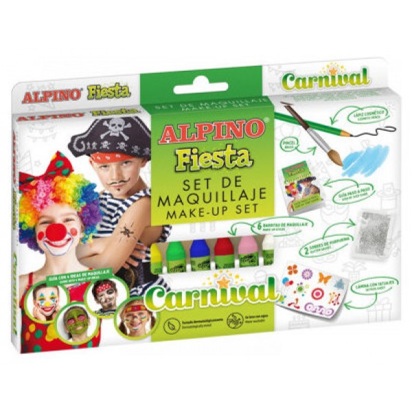 Set de maquillaje Alpino Carnival. Contiene: 6 barritas de 5 gr, color blanco, amarillo, rosa, rojo, verde y azul, tatuajes brillantes en calcomanía, lápiz perfilador cosmético, pincel, 2 bolsitas de purpurina y folleto paso a paso. Producto cosmético. Se lava con agua. Testado dermatológicamente. Maquillaje listo para usar, no necesita base maquillaje ni crema hidratante. Maquillaje para fiestas. Uso infantil y adulto.