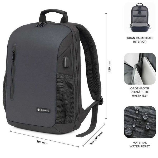 Bolsillo frontal de acceso rápido Panel interior para cargadores, bolígrafos y ratón Bolsillos laterales elásticos para botellas Puerto USB-C externo para cargar tu móvil en movimiento (requiere power bank)